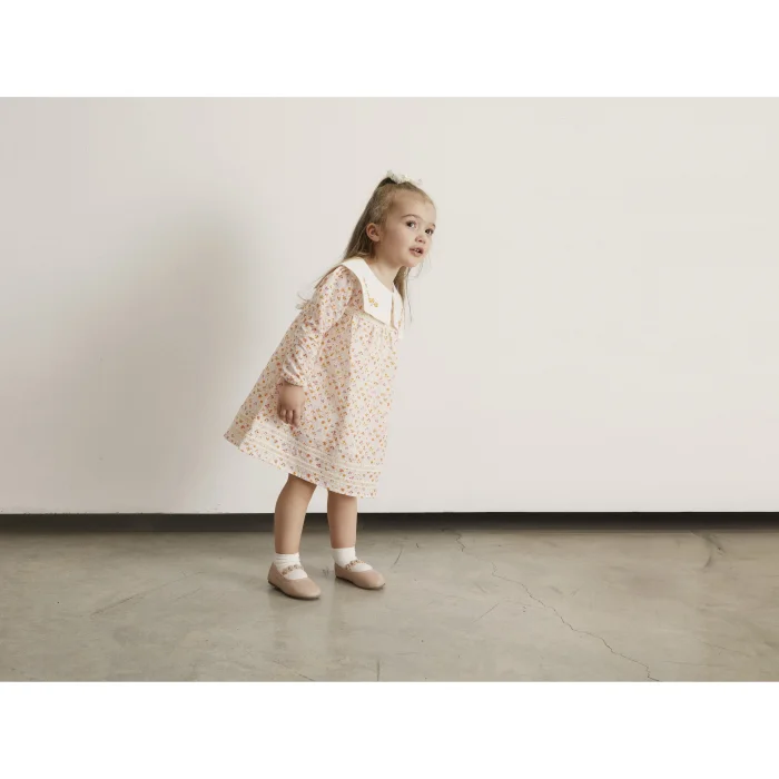 Long-sleeved dress with elastic trims, embroidered motifs on the neckline, lace details, buttons on the back and drop-shaped windows.