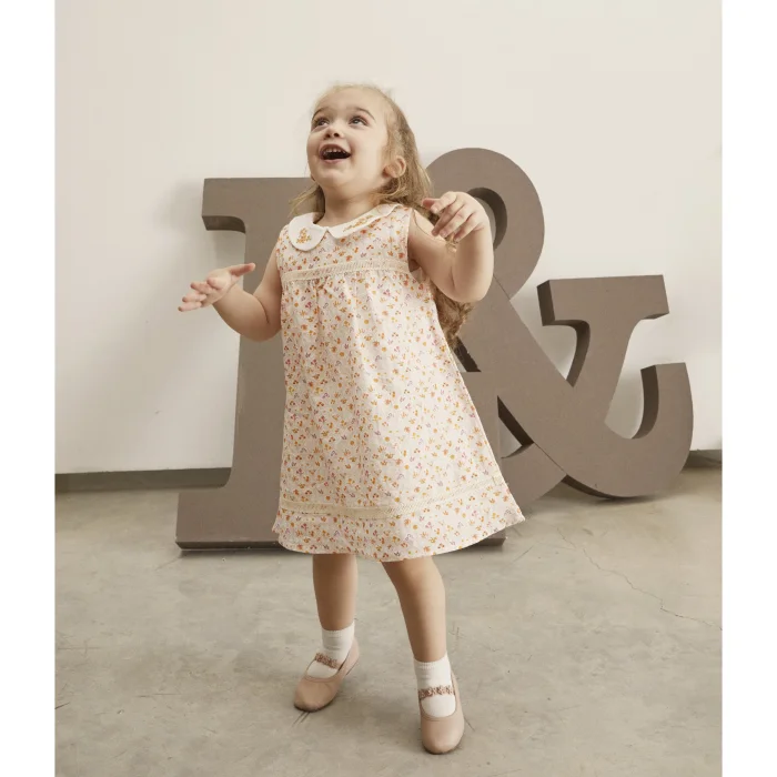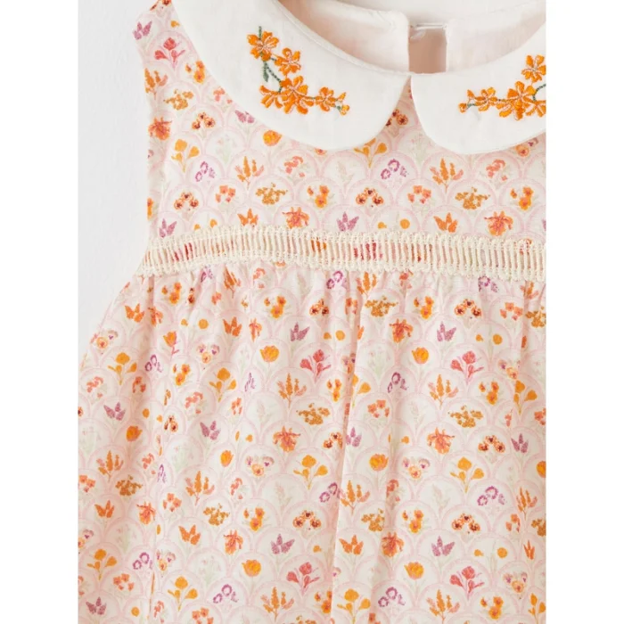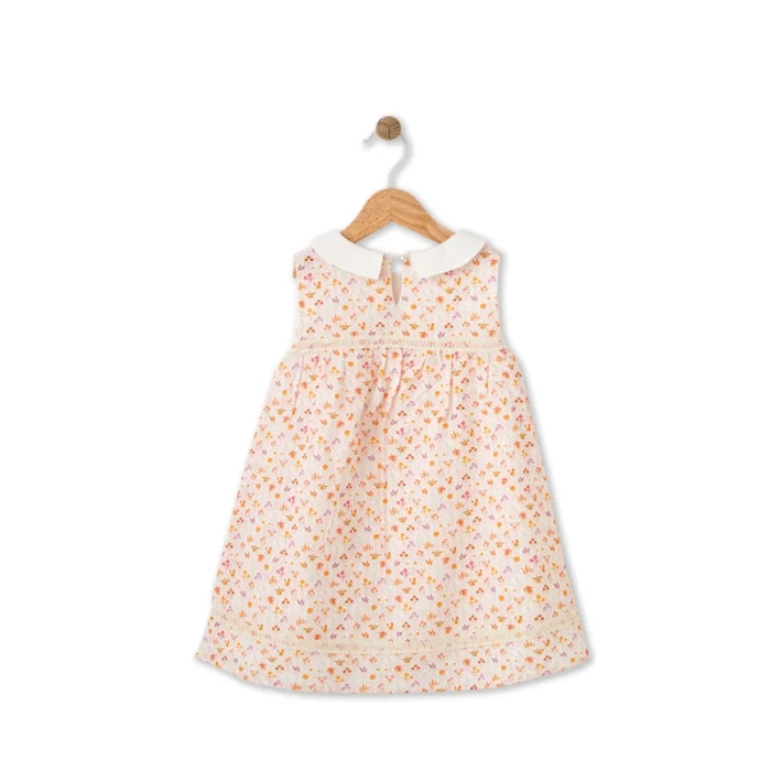 Baby collar, buttoned back and teardrop-shaped window detail, collar motif embroidery, lace detailed patterned lining sleeveless dress.