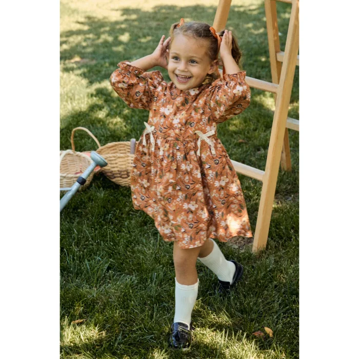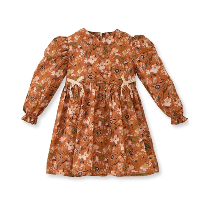 It is made of cotton fabric with a floral pattern. It has long sleeves, vintage puffy sleeves. The sleeve tip is a detailed baby overlock. It has a hidden zipper at the back. The front part is with a false ribbon. It is lined with cotton.