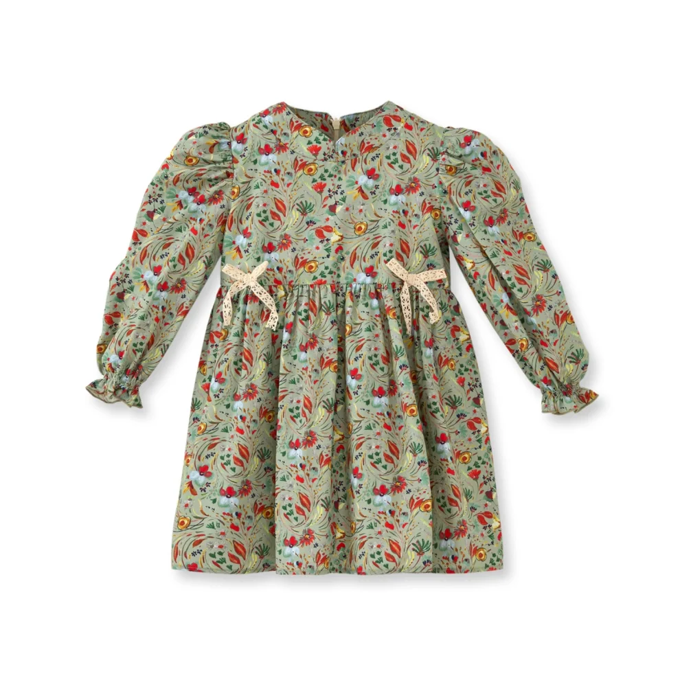 It is made of cotton fabric with a floral pattern.  It has long sleeves, vintage puffy sleeves. The sleeve tip is a detailed baby overlock. It has a hidden zipper at the back. The front part is with a false ribbon. It is lined with cotton.