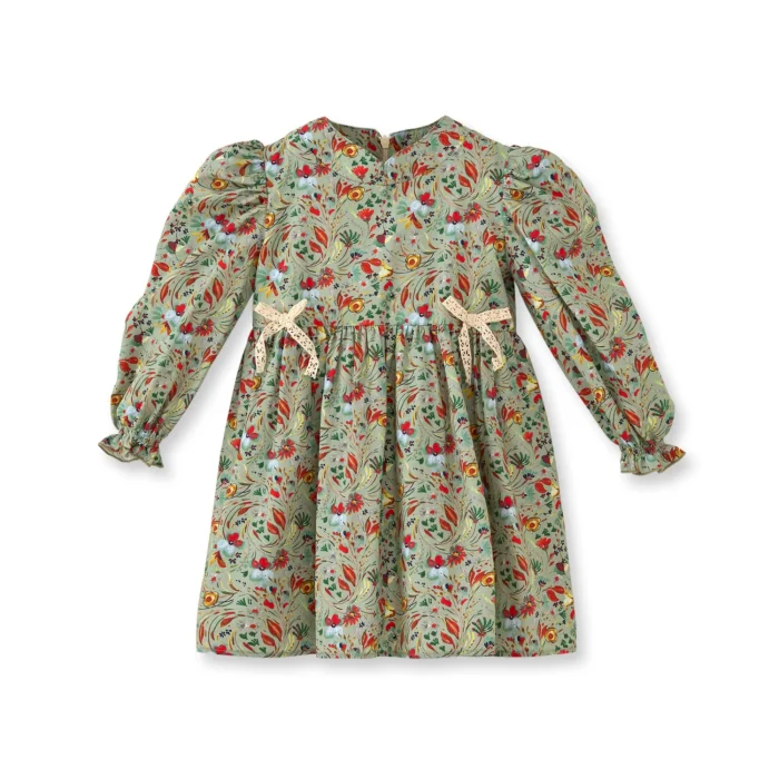 It is made of cotton fabric with a floral pattern. It has long sleeves, vintage puffy sleeves. The sleeve tip is a detailed baby overlock. It has a hidden zipper at the back. The front part is with a false ribbon. It is lined with cotton.