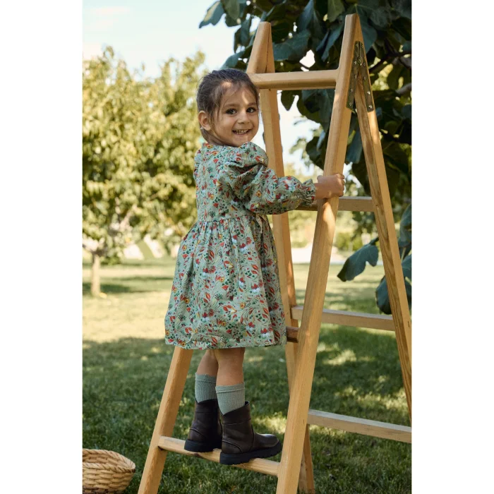 It is made of cotton fabric with a floral pattern. It has long sleeves, vintage puffy sleeves. The sleeve tip is a detailed baby overlock. It has a hidden zipper at the back. The front part is with a false ribbon. It is lined with cotton.