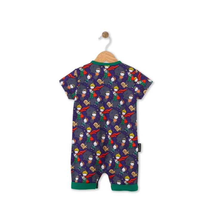 The Little Prince jumpsuit with digital printing, round neckline, short sleeves, press-studs at the front and bottom.