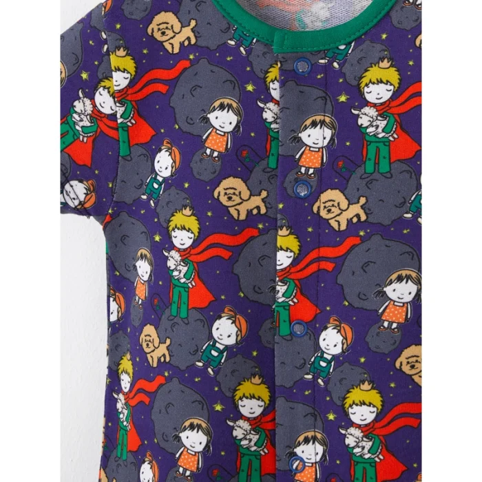 The Little Prince jumpsuit with digital printing, round neckline, short sleeves, press-studs at the front and bottom.