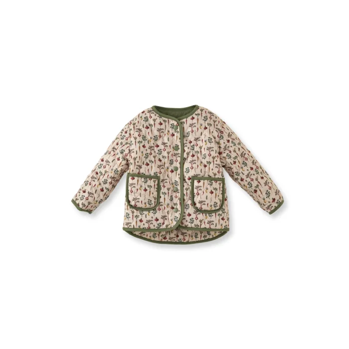 Crew neck, long sleeve jacket. It has a snap closure at the front, front patch pockets and contrasting piping detailing.