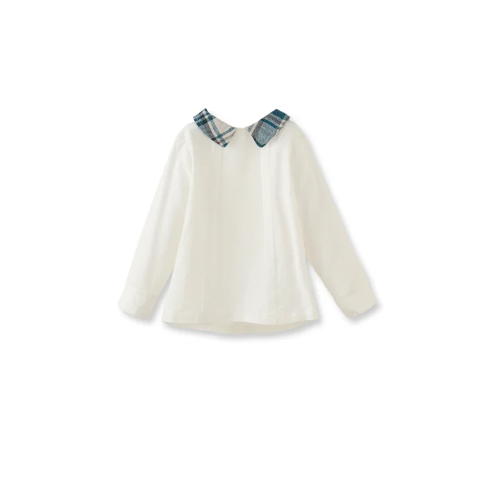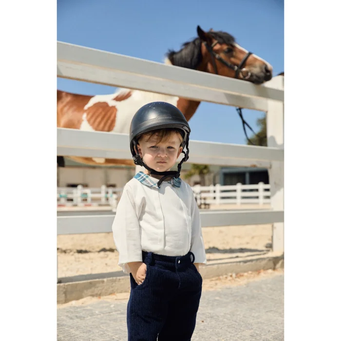 Two-piece tooling. Long sleeves with plaid collar detailing. It has two pat details on the front and studs at the back. Velvet trousers with half elasticated waist, buttons at the front and front pockets.