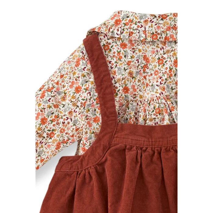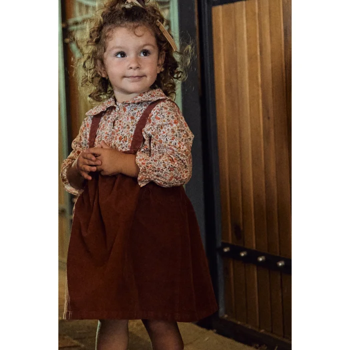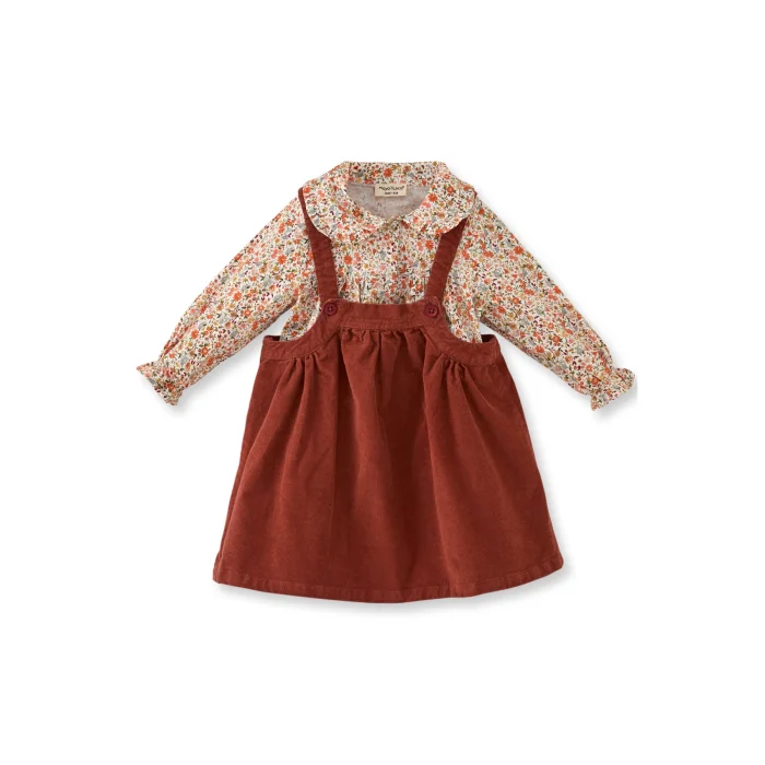 Two-piece tooling. Long sleeve shirt, baby overlock with sleeve end detail gipe. The collar has ruffle details and buttons on the front. Velvet gilet with straight neckline and adjustable button straps. The front and back are detailed with batteries.