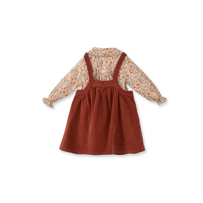 Two-piece tooling. Long sleeve shirt, baby overlock with sleeve end detail gipe. The collar has ruffle details and buttons on the front. Velvet gilet with straight neckline and adjustable button straps. The front and back are detailed with batteries.