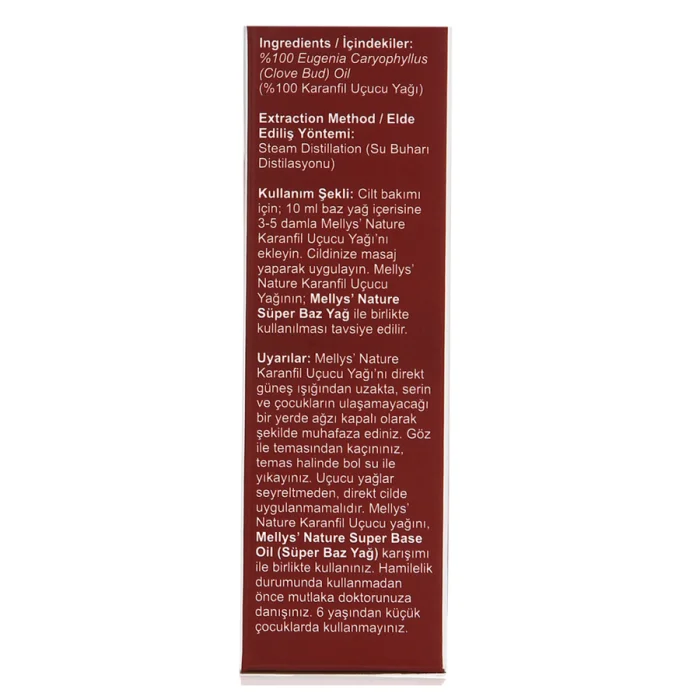 Suggested Usage: For topical use, add 5 drops Mellys’ Nature Clove Bud Essential Oil into 10 ml Mellys’ Nature Super Base Oil and mix them. Apply by massaging your skin. 2 teaspoons equal to 10 milliliter.