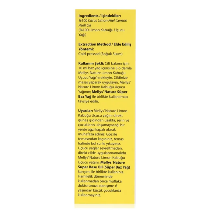 Suggested Usage: For topical use, add 5 drops Mellys’ Nature Lemon Essential Oil into 10 ml Mellys’ Nature Super Base Oil and mix them. Apply by massaging your skin. 2 teaspoons equal to 10 milliliter.