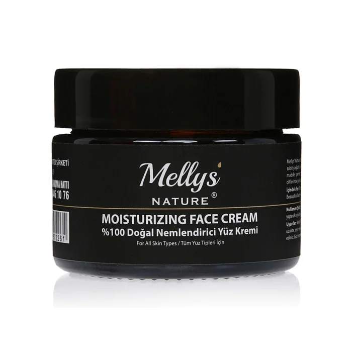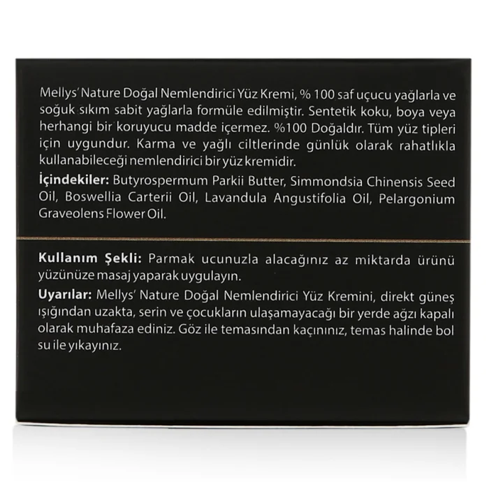 Mellys’ Nature Moisturizing Face Cream is inspired by goodness of nature that specifically formulated with %100 natural essential& cold-pressed oils for all skin types. This cream leaves skin smooth, hydrated with %100 natural scent. FREE OF: synthetics, artificial fragrances and dyes, parabens , sulfates , phthalates , PEG, GMO, mineral oil, formaldehyde, petroleum and fillers. Ingredients:Butyrospermum Parkii Butter, Simmondsia Chinensis Seed Oil, Boswellia Carterii Oil, Lavandula Angustifolia Oil, Pelargonium Graveolens Flower Oil. Suggested Usage: Finish your cleansing routine by applying moisturizing cream onto your face and neck. Massage gently with upward and outward motions. Warnings:For external use only. Keep it in a cool place, out of direct sunlight, with the lid tightly closed. Avoid eye contact. In case of contact with eyes, rinse immediately with plenty of water. Keep out of reach of children.