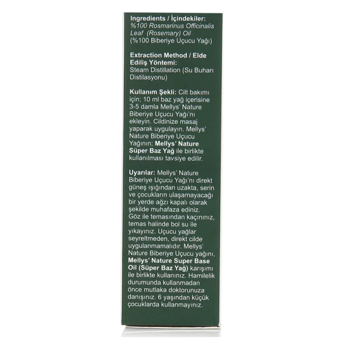 Suggested Usage: For topical use, add 5 drops Mellys’ Nature Rosemary Essential Oil into 10 ml Mellys’ Nature Super Base Oil and mix them. Apply by massaging your skin. 2 teaspoons equal to 10 milliliter.