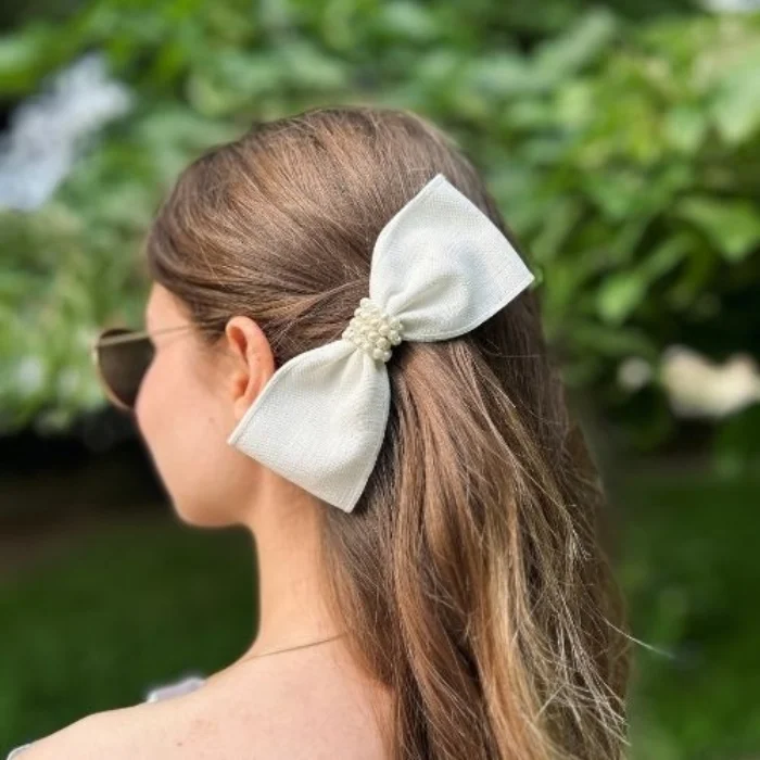 The bow clasp with pearl detail is made of linen fabric on a clasp clasp by hand.