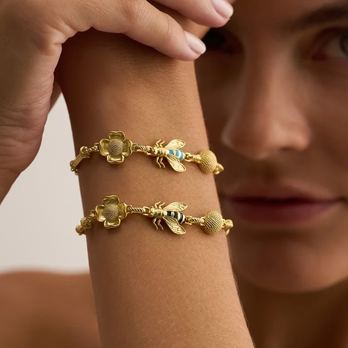 turquoise enamel bee, flower and pollen bracelet specially designed for