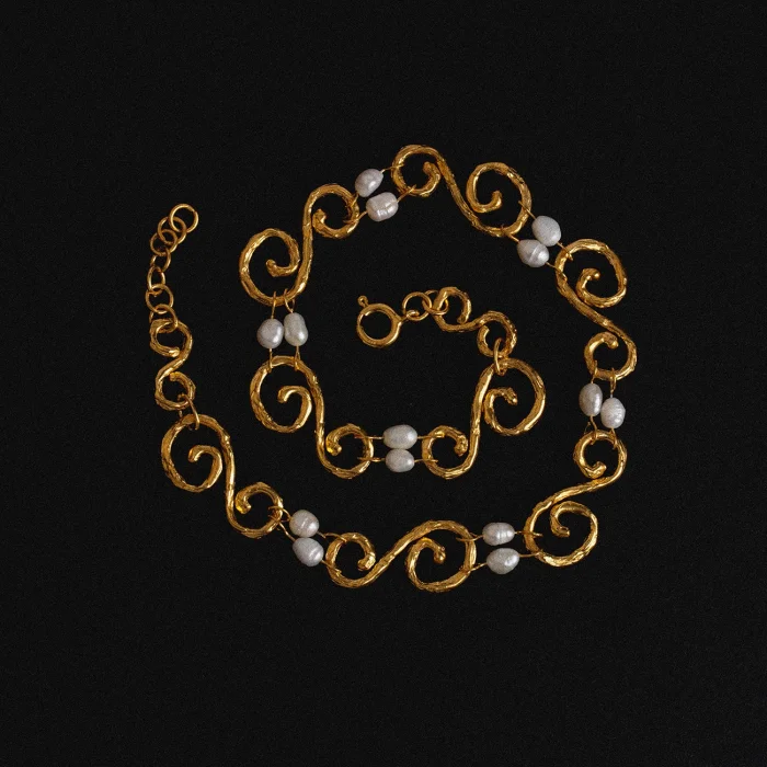 Lola is a choker necklace designed with spiral-shaped handmade pieces and elegant natural pearls; bold, feminine and with personality. Made from 925 sterling silver and with an 18k gold plated option, it adds a fun twist to your look.
