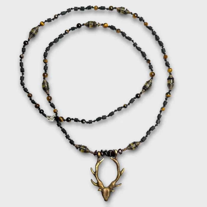Product: Mr. Deer - Antique Bronze Deer Onyx Smoke Quartz Tiger Eye Unisex Necklace