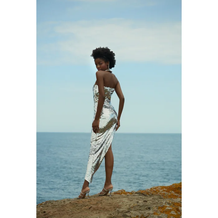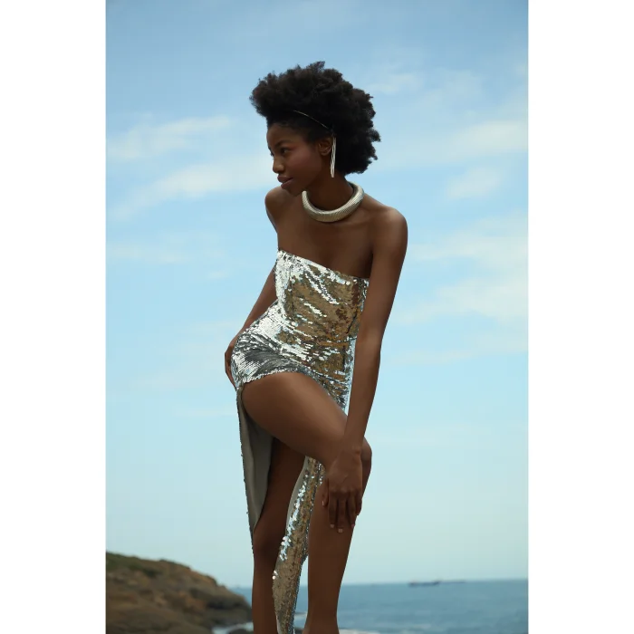 Sequined Dress With Strapless And Slit Model: Height: 177 Bust: 83 Waist: 60 Hips: 90 Product Size Worn By The Model: 36 %100 Polyester It İs A Personalized Design. The Exchange Period İs 14 Days. No Returns.