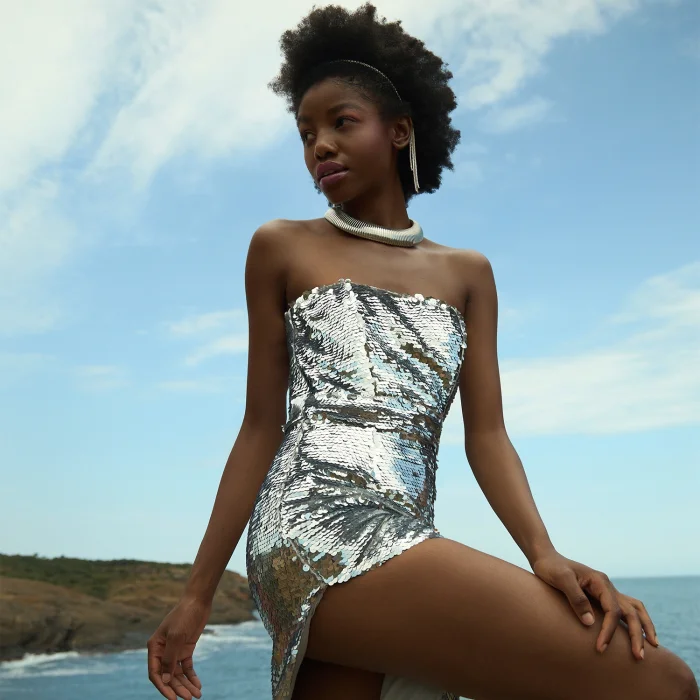 Sequined Dress With Strapless And Slit Model: Height: 177 Bust: 83 Waist: 60 Hips: 90 Product Size Worn By The Model: 36 %100 Polyester It İs A Personalized Design. The Exchange Period İs 14 Days. No Returns.
