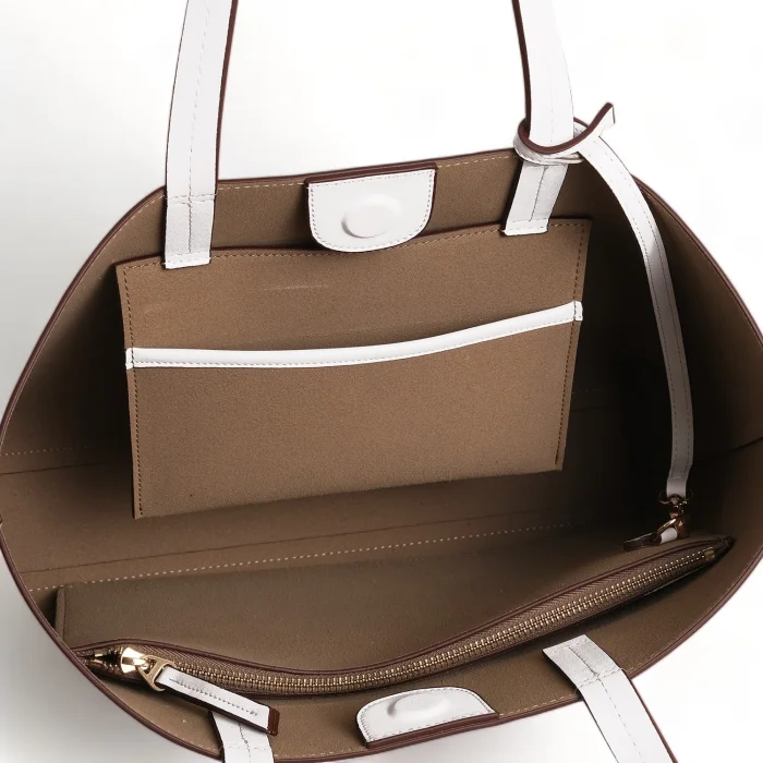 Large and quite lightweight, our shoulder bag has a detachable zippered handbag and phone compartment. Width: 42 cm (16.5") Height: 27 cm (10.5") Depth: 9 cm (3.5") Handle Height: 25 cm (10") Inner zippered pocket width: 27 cm Inner zippered pocket height: 17 cm