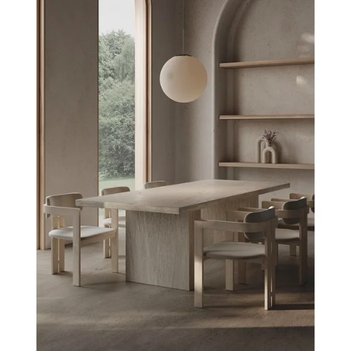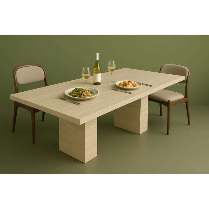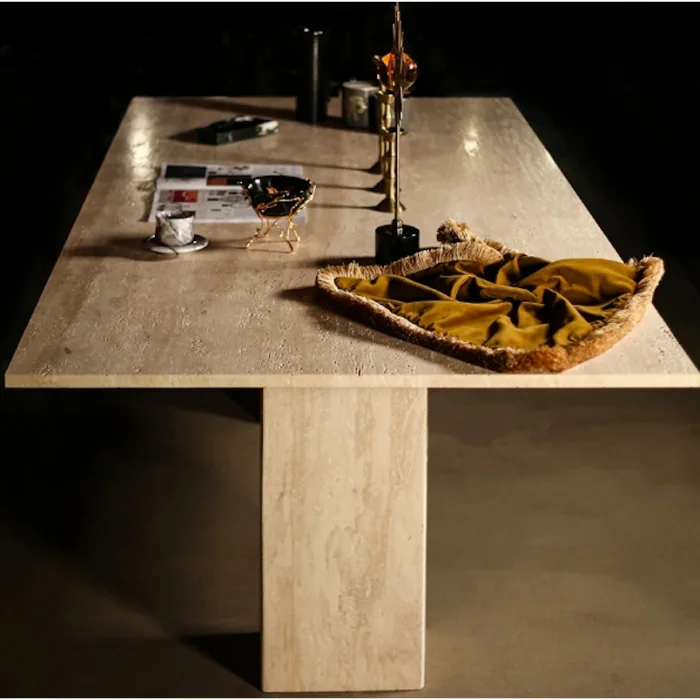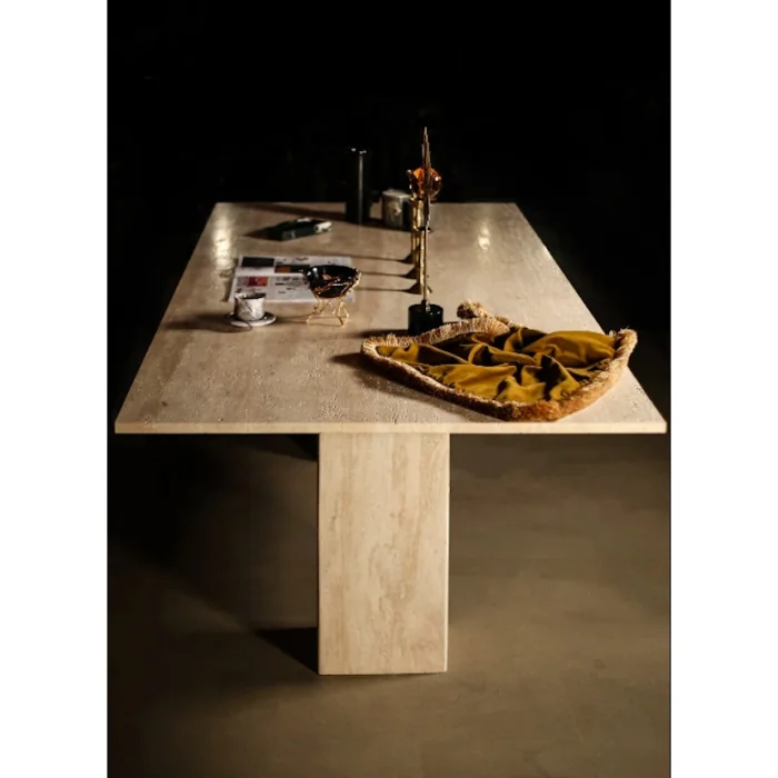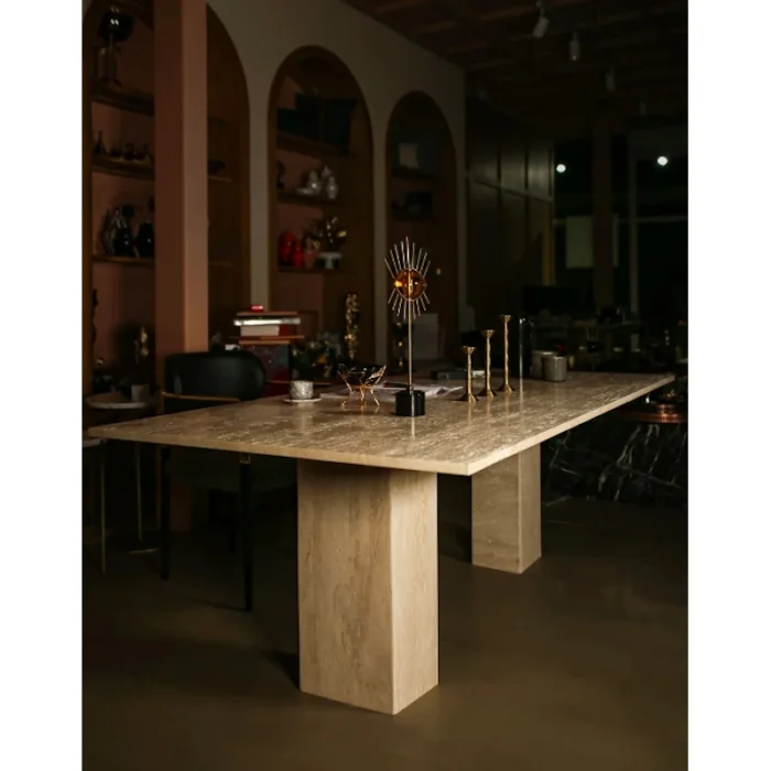 200 x 90 x 75 cm Travertine is a natural and durable rock that is shaped by the fire of volcanoes and bears the traces of thousands of years. This material adds value to your home both aesthetically and functionally. As Miarik Design, we offer you simple and stylish travertine table models by carefully processing travertine. Travertine stones are patiently processed by hand under harsh conditions. Our quality craftsmen painstakingly cut, shape, polish and put the finishing touches on these materials. Thus, we preserve the natural and organic forms of travertine and create furniture designs suitable for your home. Since the stone is a natural material with texture, color tones and vascular pathways, it makes each product unique and unique. In addition, the surface of the stone is matte and has unique tiny pores. These differences are an indicator of the naturalness of travertine. Please place an order taking these into account. If you wish, the pores of the stone can be closed, and you can have matte or polished options of the surface with a special order. Our recommendation is that it be porous and in matte form. It will add a natural elegance to your home.
