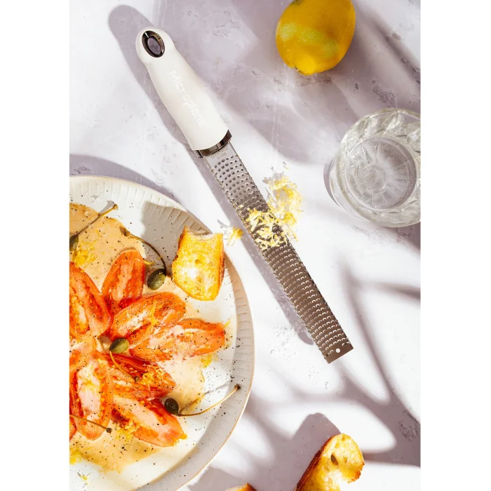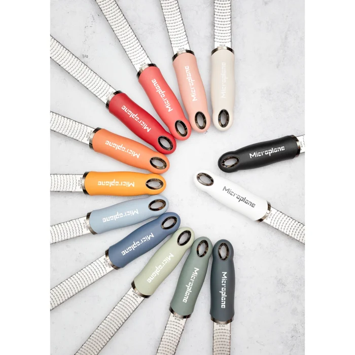 The original, iconic Premium Classic Zester, characteristically long and narrow revolutionized grating due to its ultra-sharp, photo-etched stainless-steel blade - made in USA. Featuring 400 micro-teeth, it is perfect for all citrus fruits, hard cheese, chocolate, ginger, garlic, nutmeg, truffle, spices, nuts and more.