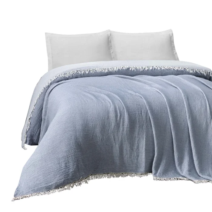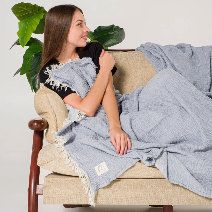 Our 3-layer double-sided breathable crepe muslin, produced from organic 100% Turkish cotton, is used for 4 seasons as a bed shawl, sofa shawl, TV blanket, pique with its soft texture produced with a very special weaving technique.