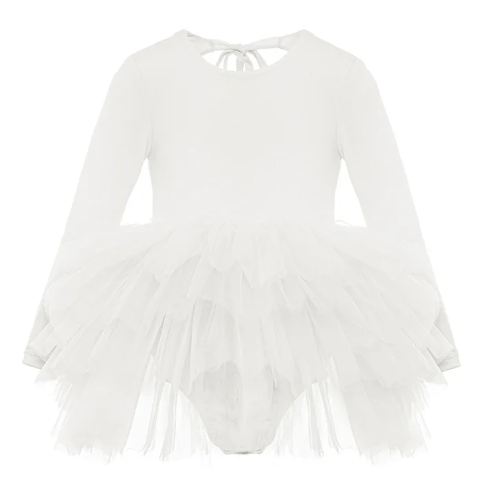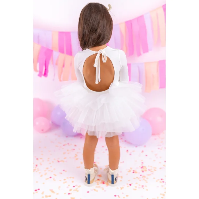 Off-white tutu dress with crewneck, backless and necktie detailing. There is a swimsuit lining with snaps under the tutu skirt.