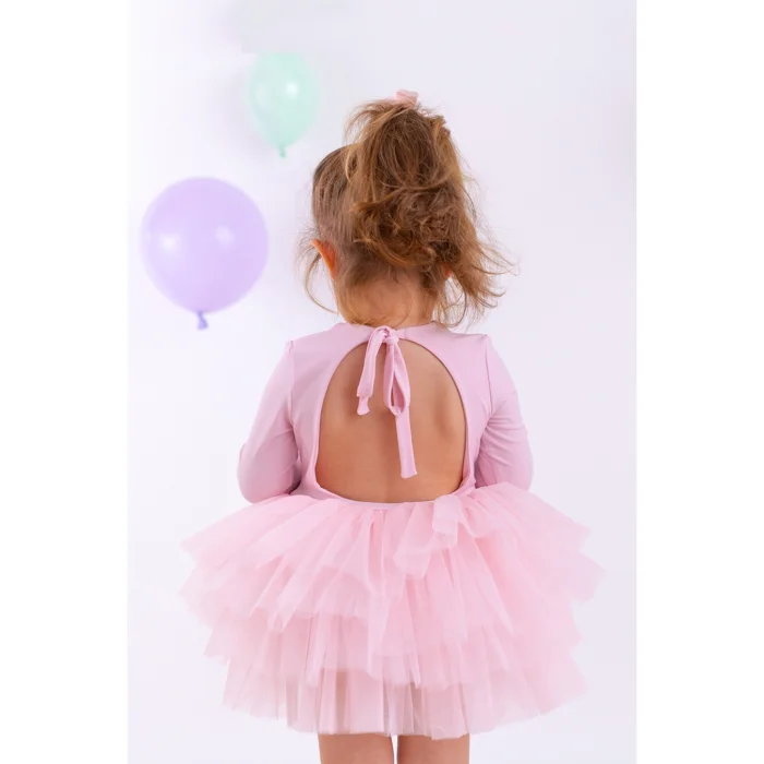 Pink tutu dress with crewneck, backless and tie detail at the neck. There is a swimsuit lining with snaps under the tutu skirt.
