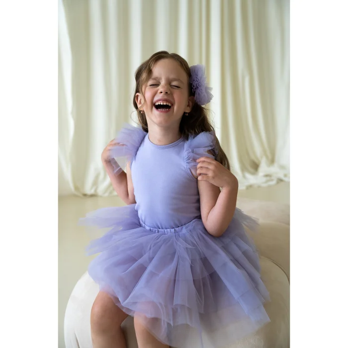 Lilac tulle ruffled bodysuit and skirt suit. A bissel neckline, a bodysuit with sleeve ruffle details and a tutu skirt with shorts inside. The back is with drop and button detail. It is made of cotton fabric.