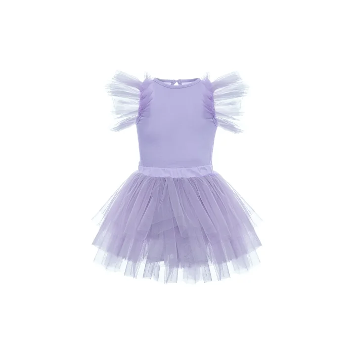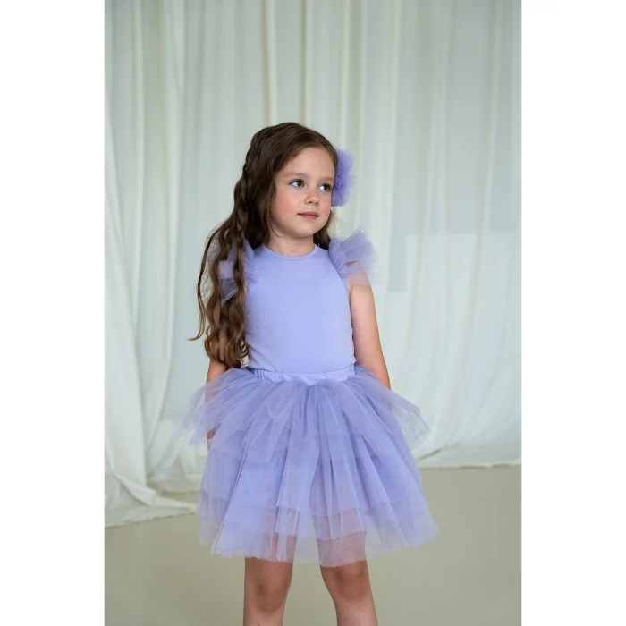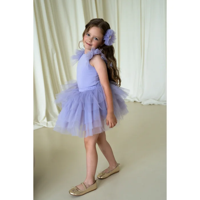 Lilac tulle ruffled bodysuit and skirt suit. A bissel neckline, a bodysuit with sleeve ruffle details and a tutu skirt with shorts inside. The back is with drop and button detail. It is made of cotton fabric.