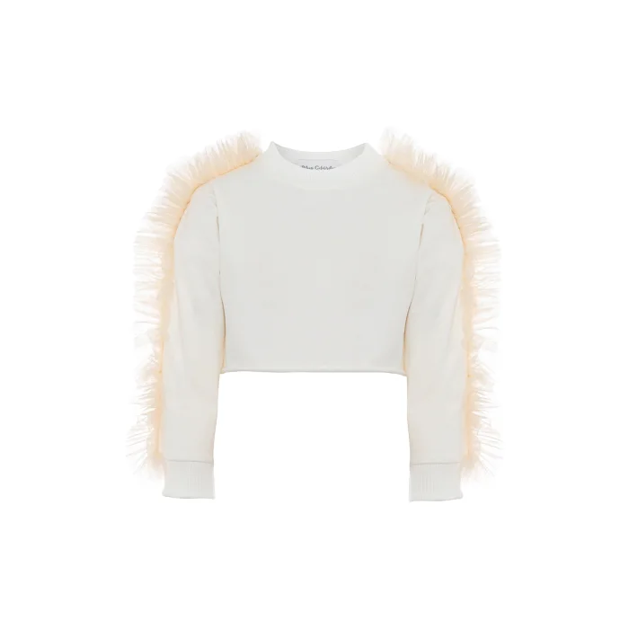 It is made of Off-White 2-thread fabric. Short crop sweat at waist length. Shoulders and sleeves with tulle ruffle detail.
