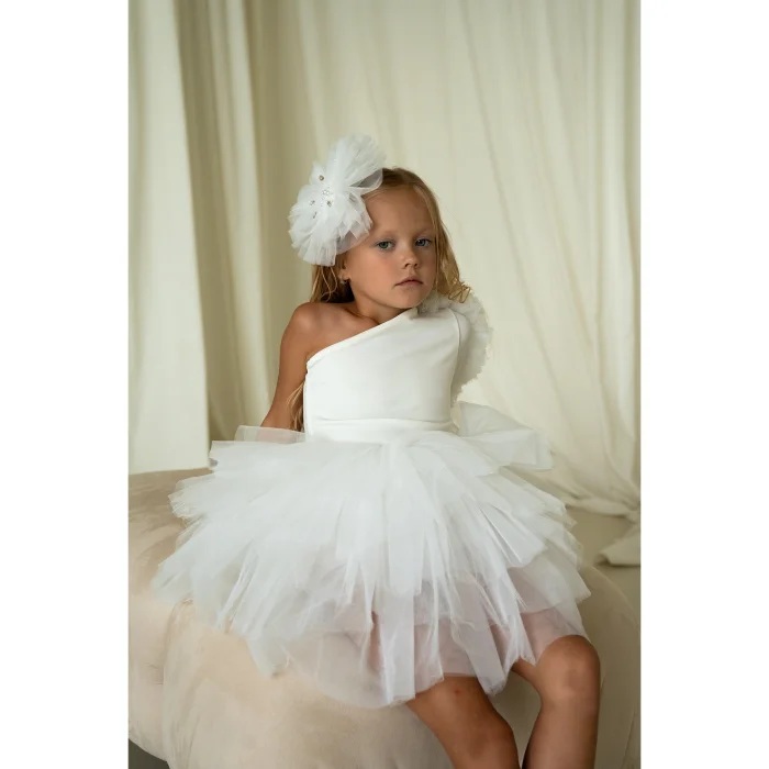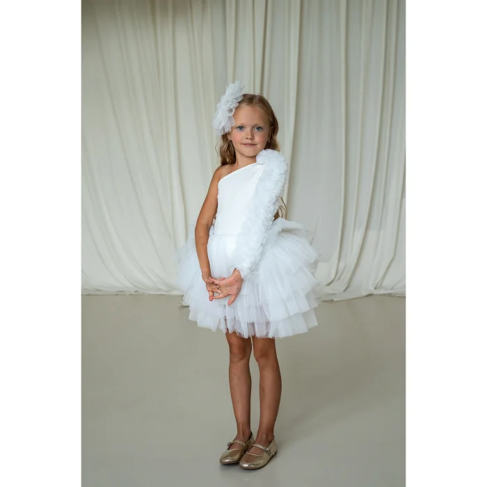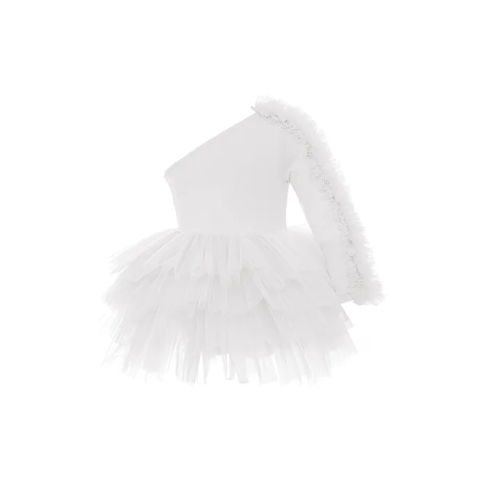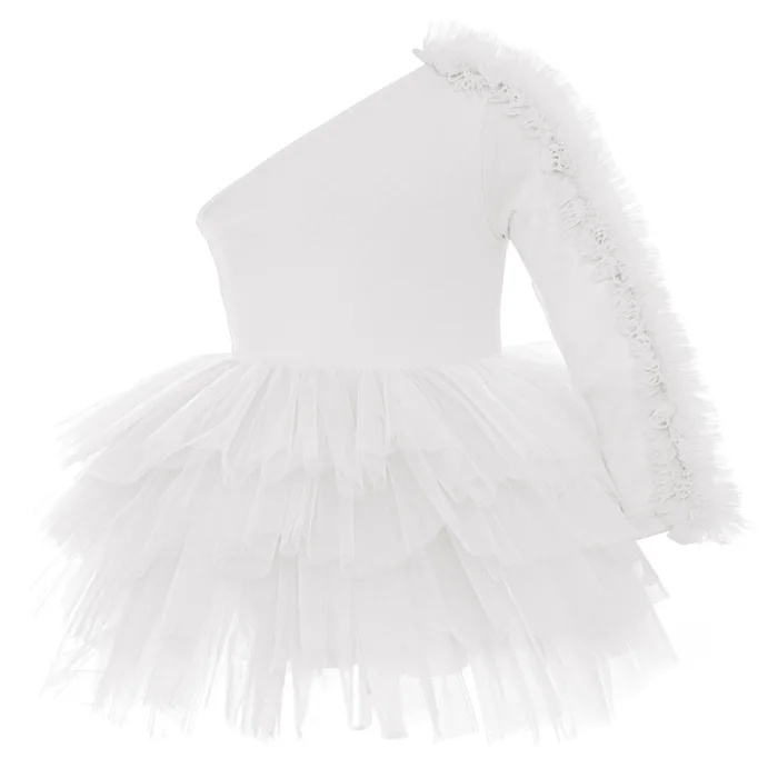 One shoulder, long sleeves, off-white tutu dress with shoulder and sleeve ruffle tulle detail There is a swimsuit lining with press-studs under the tutu skirt
