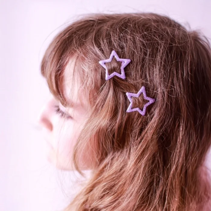 Mini Star Buckles Product Description: The star shape covered in shiny glitter offers eye-catching elegance for little girls. Material: Glitter, Metal Size: 3x3 cm Colors: Lilac, Pink, Blue, Nude