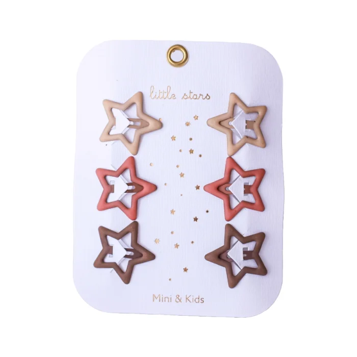 Mini Star Buckles Product Description: The star shape covered in shiny glitter offers eye-catching elegance for little girls. Material: Glitter, Metal Size: 3x3 cm Colors: Lilac, Pink, Blue, Nude