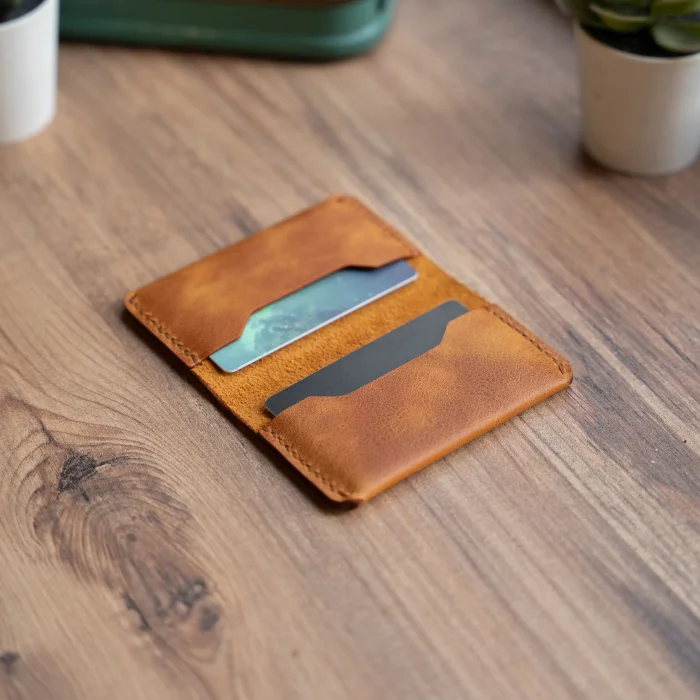 minimal X Fold Folding Card Holder Thin, useful and stylish card holder... Material: Genuine Calf Leather Closed Dimensions: 10.5 x 6.5 cm Leather Thickness: 1.3 - 1.4 mm Blank Thickness: 5.2 mm Its maximum capacity is 9-10 cards. Or a couple of banknotes along with 7-8 cards. Minimalist and Stylish Design. It is real leather and handmade. Our products are sent as a standard gift package. NOTE: Since it is real leather, there may be slight color tone differences. NOTE2: Products and pens other than the Leather Pen Holder are not included in the use of visual decoration purposes.