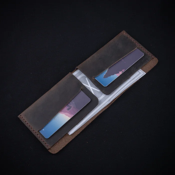 minimal X Coin Wallet Material: Genuine Calf Leather Closed Dimensions: 10.5 x 8 cm Leather Thickness: 1.3 - 1.4 mm Thickness of the empty wallet: 5.2 mm Product Weight: 40 Grams There are 2 card compartments and 1 money compartment. Minimalist and Stylish Design. It is real leather and handmade. Our products are sent as a standard gift package. NOTE: Since it is real leather, there may be slight color tone differences. NOTE2: Products other than Leather Wallet are used for visual décor purposes and are not included.