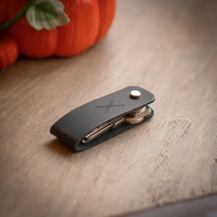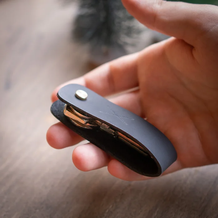 minimal X Long Keychain (2-3 or 3-4 Key Capacity) Material: Genuine Calf Leather Leather thickness: 1.3 - 1.4 mm Pin holding keys: Brass Closed product dimensions: 8.5 x 2.5 cm Product Weight: 20 grams Since the diameter of the pin holding the keys is 4mm, Keys with keyholes smaller than 4mm are not supported. Switches with a maximum length of 7.5 cm are supported. Some Switches can be thicker than normal, which can reduce the switch capacity from 3 to 2. Minimalist and Stylish Design. It is real leather and handmade. Our products are sent as a standard gift package. NOTE: Since it is real leather, there may be slight color tone differences. NOTE2: Products other than Leather Keychain are not included as used for visual décor purposes.