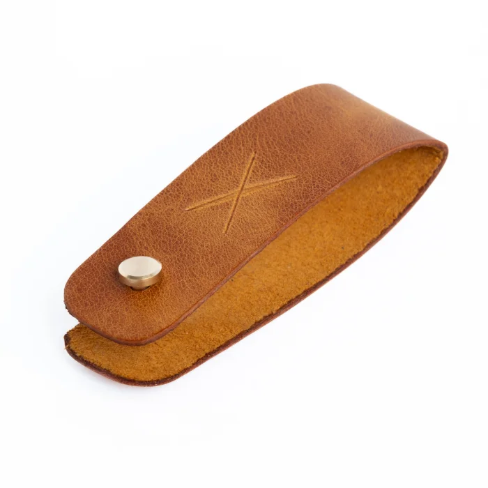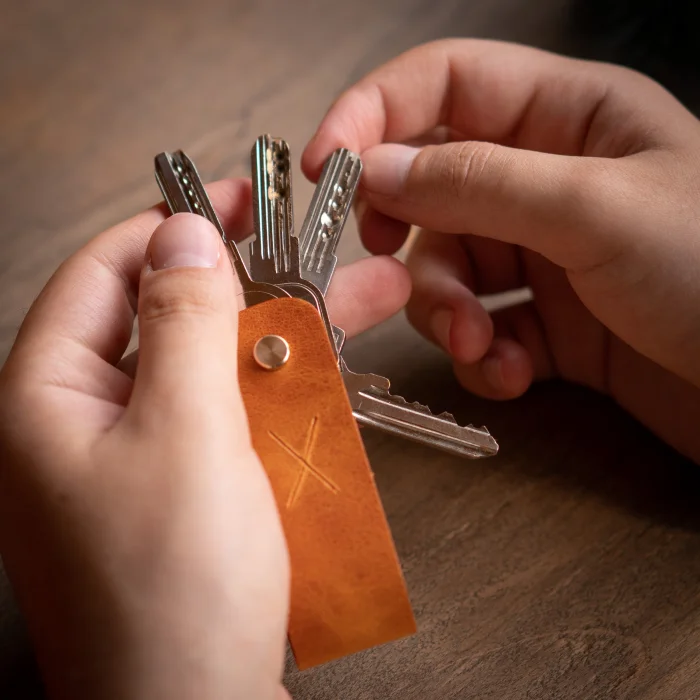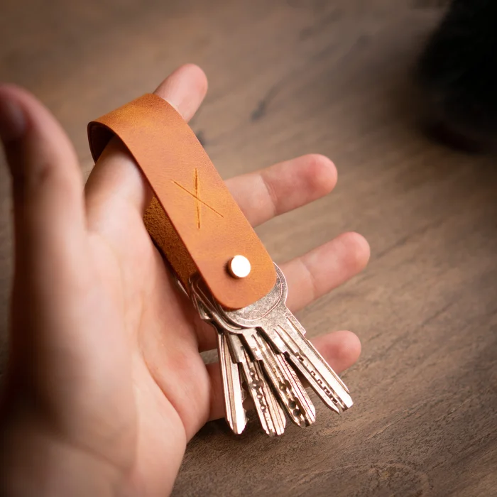 minimal X Long Keychain (2-3 or 3-4 Key Capacity) Material: Genuine Calf Leather Leather thickness: 1.3 - 1.4 mm Pin holding keys: Brass Closed product dimensions: 8.5 x 2.5 cm Product Weight: 20 grams Since the diameter of the pin holding the keys is 4mm, Keys with keyholes smaller than 4mm are not supported. Switches with a maximum length of 7.5 cm are supported. Some Switches can be thicker than normal, which can reduce the switch capacity from 3 to 2. Minimalist and Stylish Design. It is real leather and handmade. Our products are sent as a standard gift package. NOTE: Since it is real leather, there may be slight color tone differences. NOTE2: Products other than Leather Keychain are not included as used for visual décor purposes.