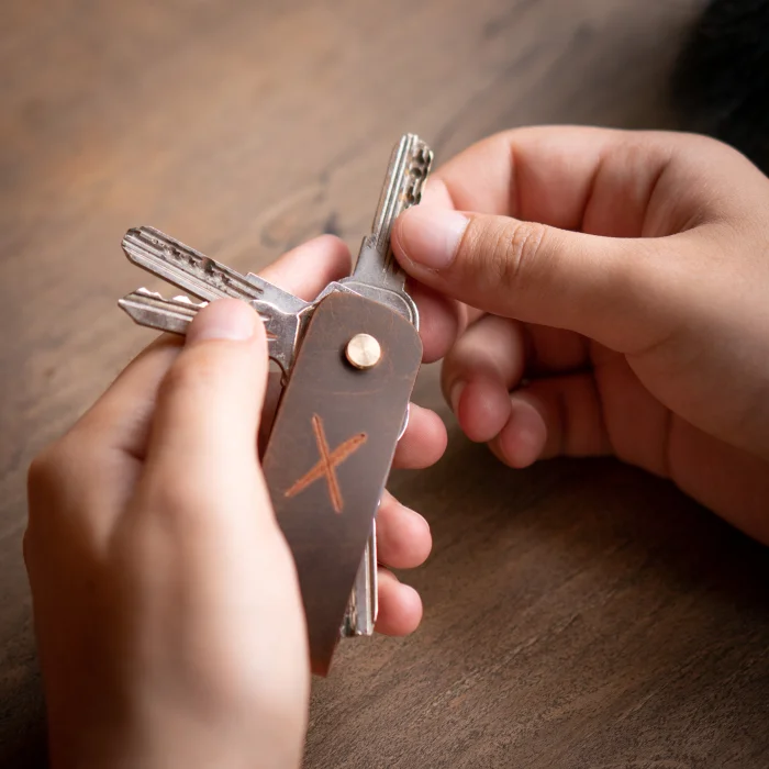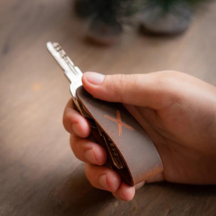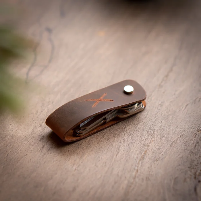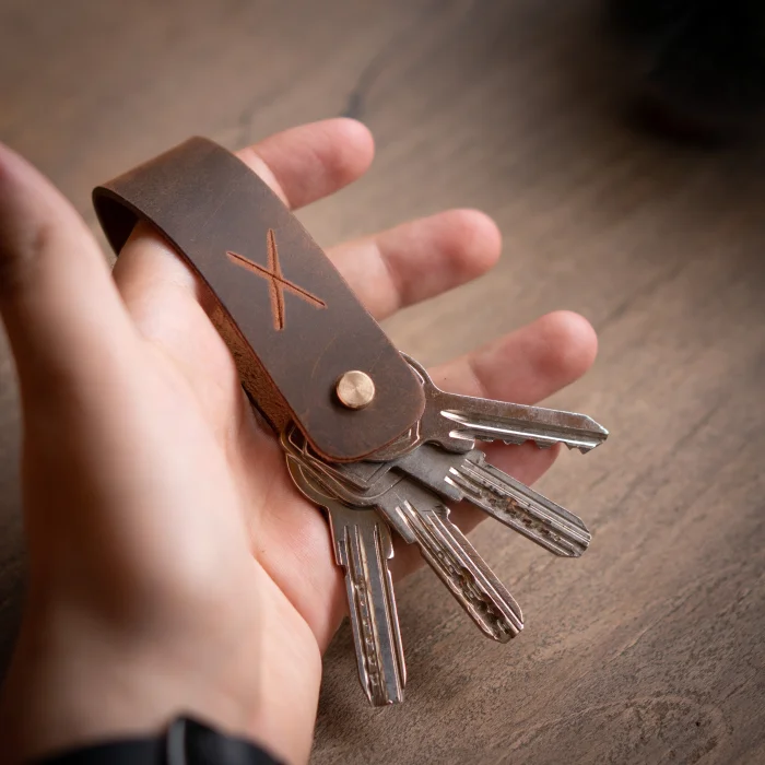 minimal X Long Keychain (2-3 or 3-4 Key Capacity) Material: Genuine Calf Leather Leather thickness: 1.3 - 1.4 mm Pin holding keys: Brass Closed product dimensions: 8.5 x 2.5 cm Product Weight: 20 grams Since the diameter of the pin holding the keys is 4mm, Keys with keyholes smaller than 4mm are not supported. Switches with a maximum length of 7.5 cm are supported. Some Switches can be thicker than normal, which can reduce the switch capacity from 3 to 2. Minimalist and Stylish Design. It is real leather and handmade. Our products are sent as a standard gift package. NOTE: Since it is real leather, there may be slight color tone differences. NOTE2: Products other than Leather Keychain are not included as used for visual décor purposes.