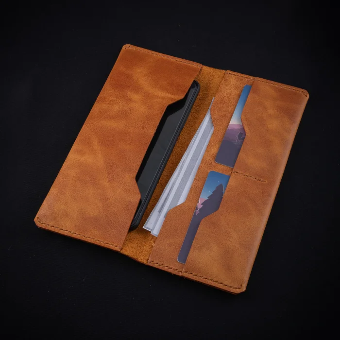 minimal X LONG - Money & Phone Wallet Material: Genuine Calf Leather Closed Dimensions: 20 x 9 cm Leather Thickness: 1.3 - 1.4 mm Product Weight: 80 Grams There are 2 Card Compartments (6 card capacity, 3 cards per section). There is 1 money compartment and 1 telephone compartment. Unlined, simple minimalist design... Minimalist and Stylish Design. It is real leather and handmade. Our products are sent as a standard gift package. NOTE: Since it is real leather, there may be slight color tone differences. NOTE2: Products other than Leather Wallet and phone are not included which are used for visual décor purposes.