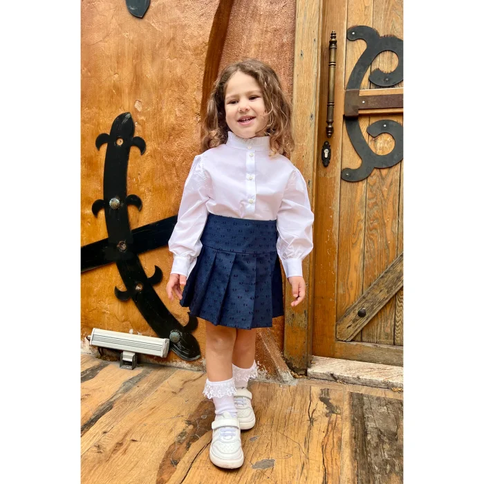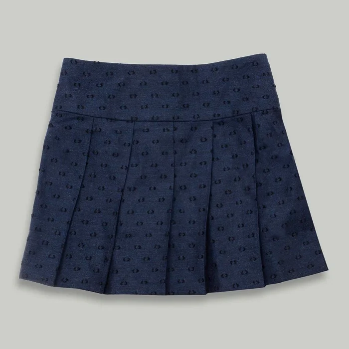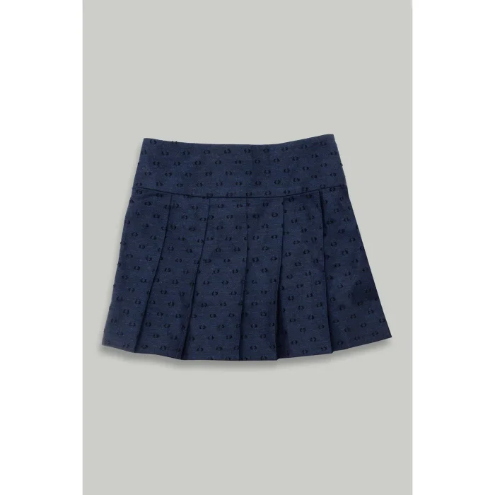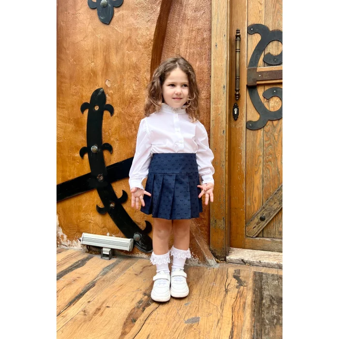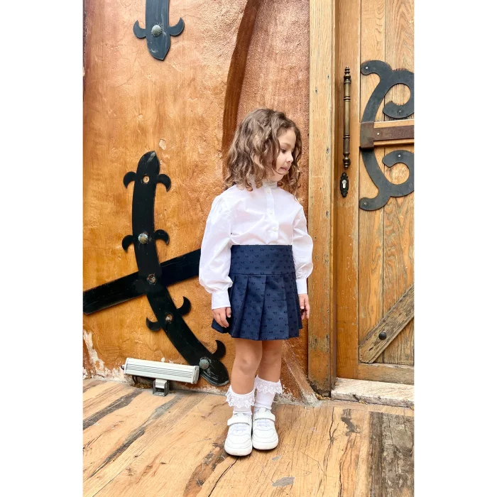 Pleated Woven Mini Navy Blue Girls' Skirt is one of the essential pieces that should be in the wardrobe of little ladies with its elegant and stylish design. Thanks to its 100% cotton fabric, it offers comfort all day long with its soft texture, while its pleated structure supports freedom of movement. It can be easily preferred in any environment, from daily combinations to special invitations.