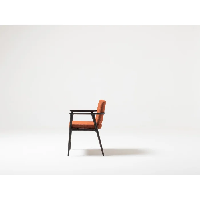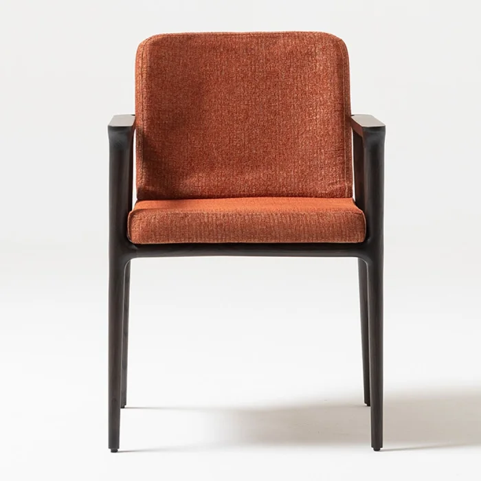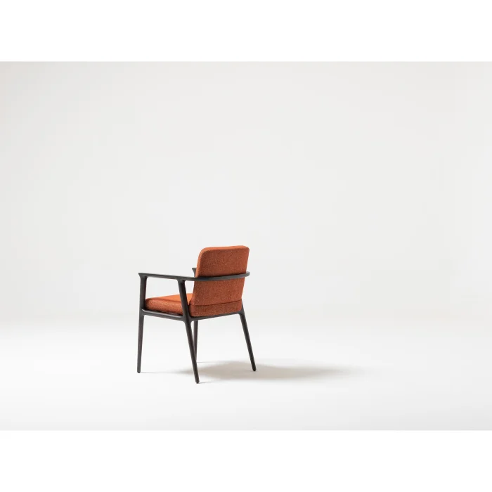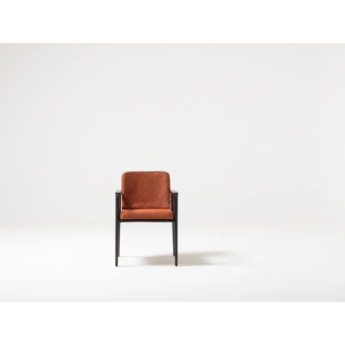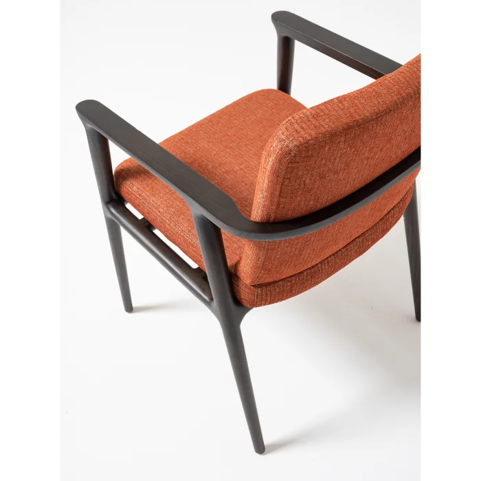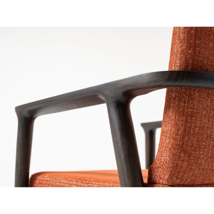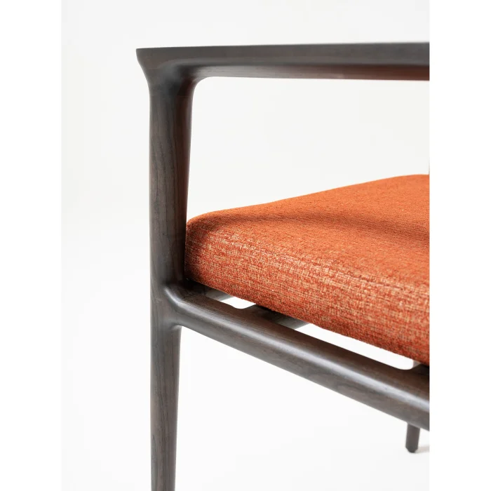 adds a sophisticated atmosphere to your living spaces with its dark wood body and upholstery in warm tones.
