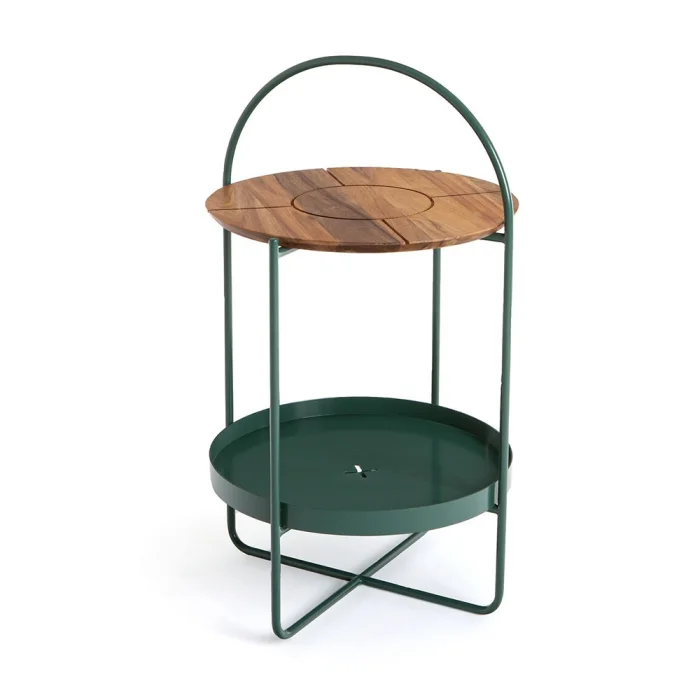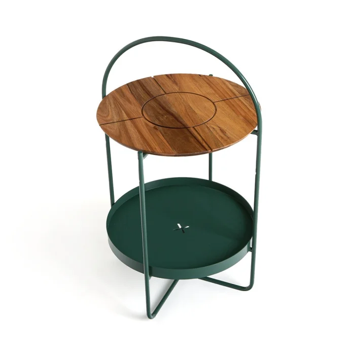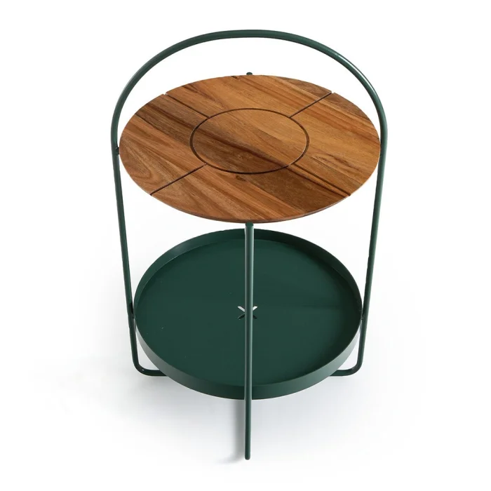 The top shelf is solid wood material. The shelf located at the bottom is sheet metal. The metal parts are painted with oven paint. The wooden part is polished with natural varnish.