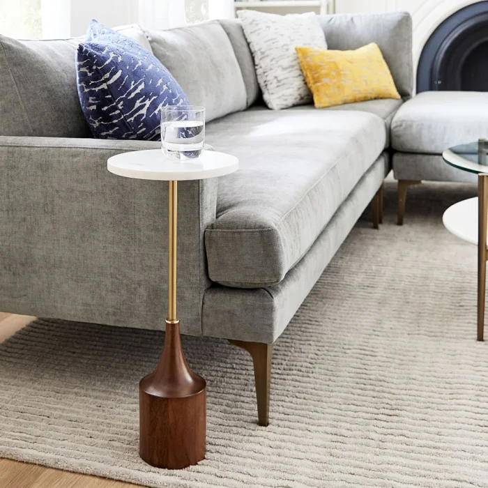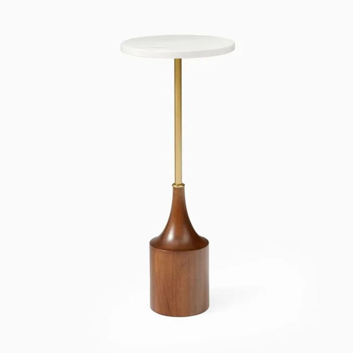 The top table is made of wood mdf material and painted with white lacquer varnish. The metal pipe in the middle is painted with electrostatic oven paint. The log wood that forms the leg of the coffee table is processed in solid and polished with a light walnut color.