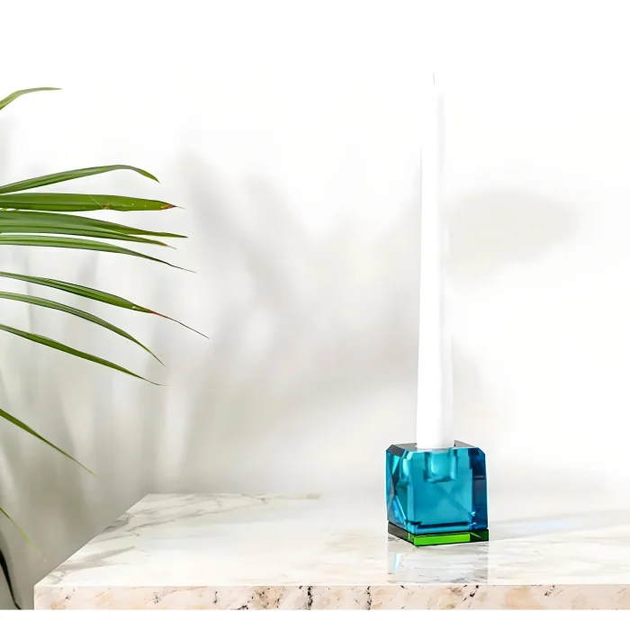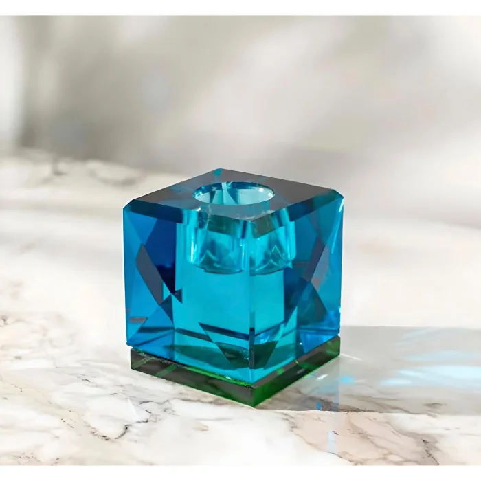 Product: Blue/green Sparkle Dice Shape Glass Candlestick - Modern And Stylish Decor Option