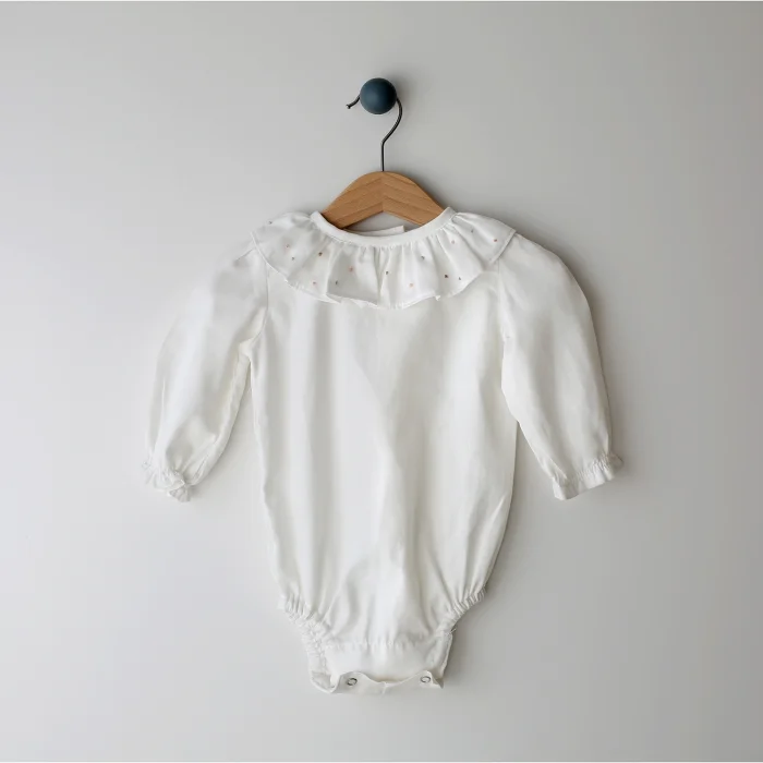 • Our specially designed ruffle collar shirt can be combined with both cardigans and overalls. Hand embroidery seed embroidery is embroidered on the collar detail. Product dimensions are from the shoulder to the end of the cloth.