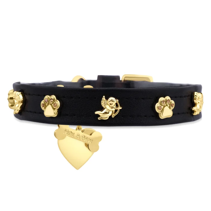 It is elegantly embellished with gold-plated tiny hearts and love angels on vegan-friendly leather fabric. This collar will be a unique accessory to complement your dog's style on special occasions while also providing a great option for everyday wear.