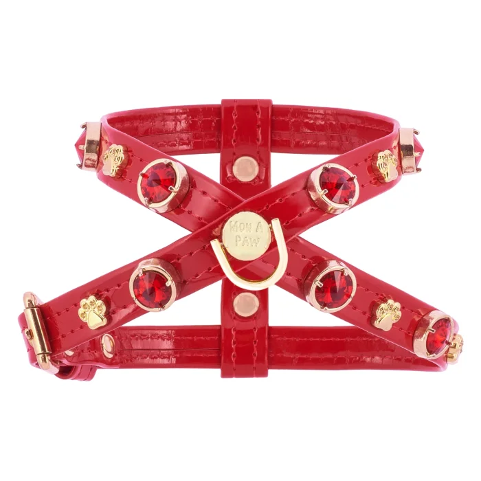 is elegantly embellished with shimmering red colored Swarovski crystals and gold-plated tiny paws on bright red vegan-friendly shimmering leather. This Harness will be a unique accessory to complement your dog's style on special occasions while providing a great option for everyday wear. You can complete your dog's look with a walking strap adorned with swarovski crystals of the same color.