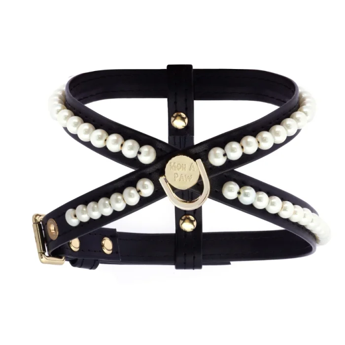 is elegantly embellished with crisp white pearls on soft black vegan-friendly leather. This Harness will be a unique accessory to complement your dog's style on special occasions while providing a great option for everyday wear. You can complete your dog's look with a vegan-friendly leather  walking strap in the same color.