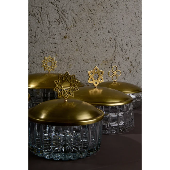 Glass bowl, brass lid with geometric pattern.